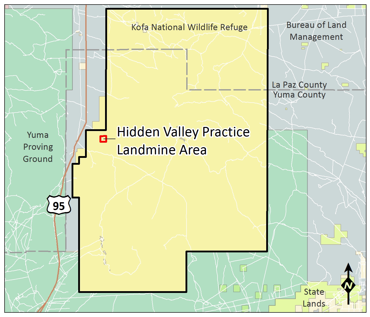 The Hidden Valley Practice Landmine Area project comprises 426 acres. The project area was used as a maneuver area in which munitions such as antitank mines, small arms ammunition, bombs, and target practice and high explosive munitions were used. Occasional light bivouac training also took place on this project area. In 1984, an M1 anti-tank practice mine was found by Kofa National Wildlife Refuge personnel. A single piece of fragmentation from a 37mm munition was also discovered in this area in 2008 by Corps of Engineers personnel.